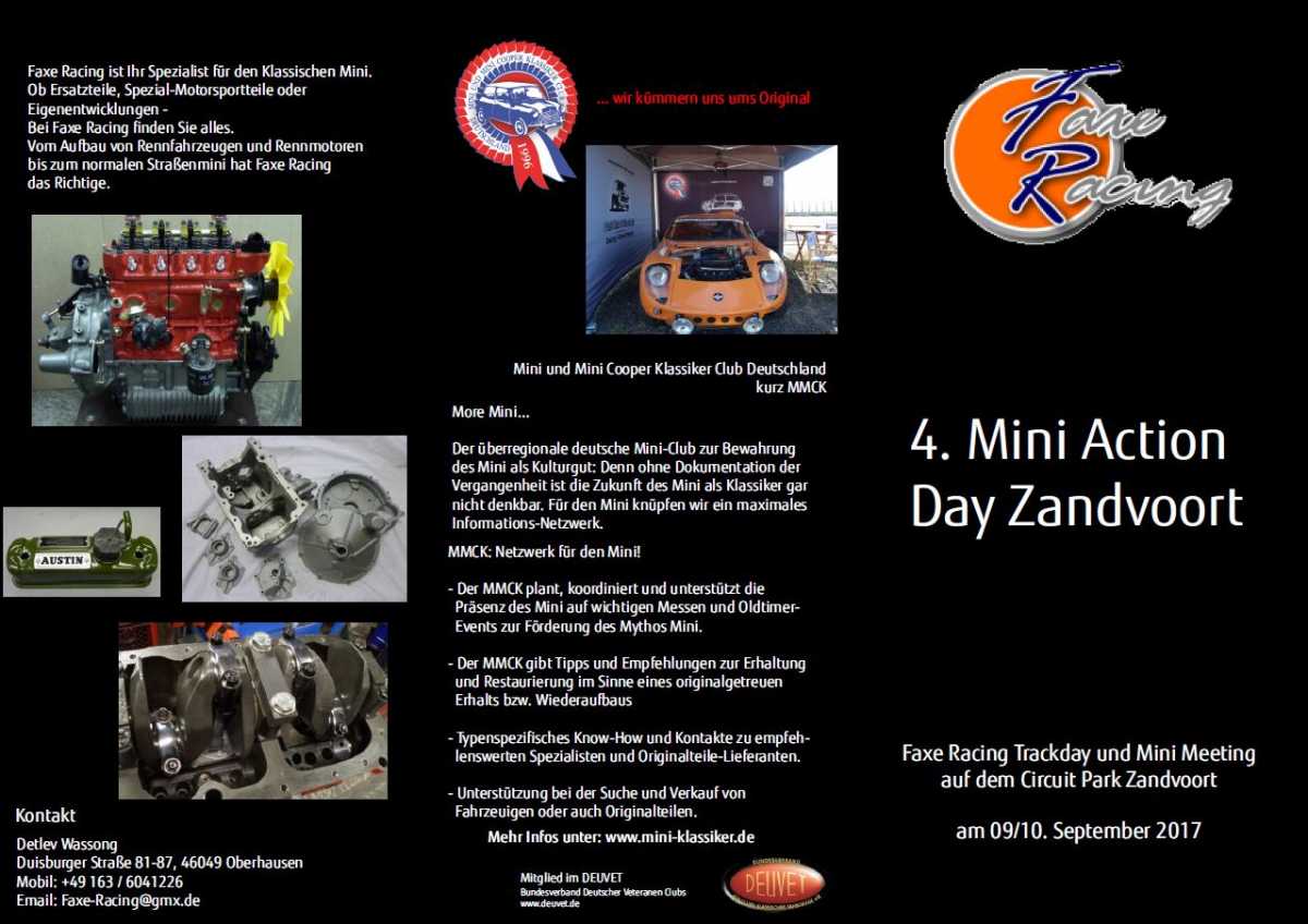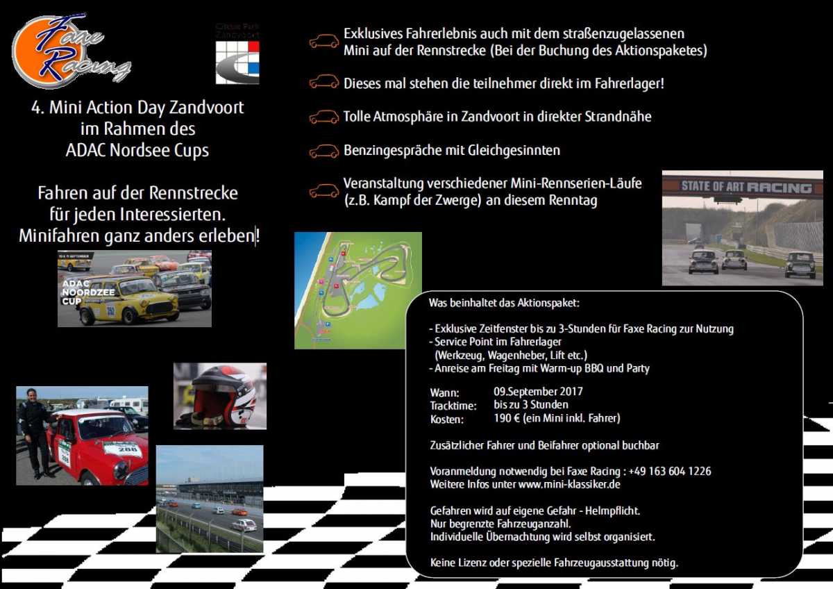 Wie im letzten Jahr, findet auch im Rahmen des diesjährigen Nordsee Cup Zandvoort, der 4. Mini Action Day statt. Organisiert von Faxe-Racing, steht bei Faxe der Mini natürlich im Focus. Aber selbstverständlich ist der Mini Action Day auch wieder für alle Marken offen. Es werden insgesamt 120 Minuten Fahrzeit auf der ehemaligen Formel 1 Strecke in den Dünen geboten.
